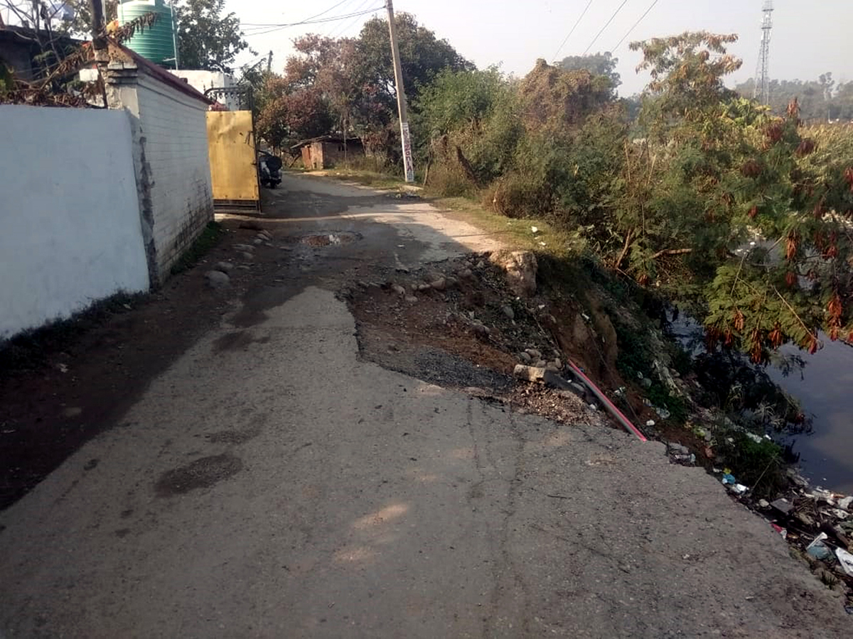 When contacted Yudhvir Singh-the Corporator of Ward number-73 under which this area falls, said there is even no light at the damaged portion of the road and any vehicle may fall there in dark or any individual may also fall into about 30 feet deep ditch besides the road where a Nallah flows.