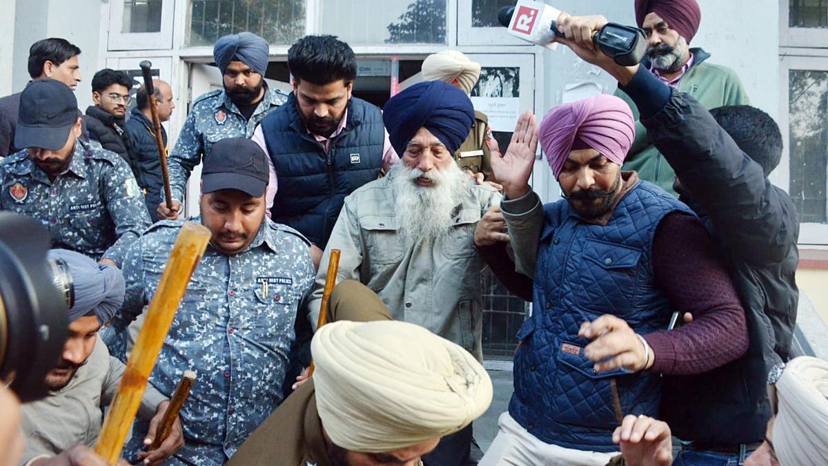 The attack targeting Mr. Badal had been captured on cameras by media persons, who had then gathered to cover the second day of the Akali leader performing the duty of ‘sewadar’ at the main gate of the Sikh shrine as religious penance for “mistakes” committed by the SAD government in Punjab from 2007 to 2017. (PTI)