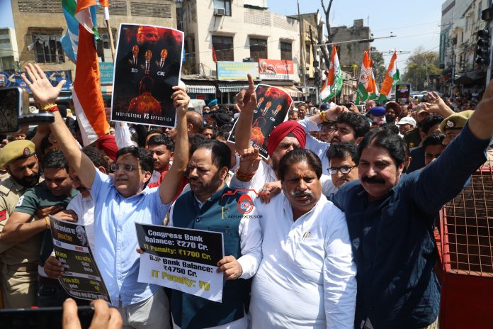 Jammu/Srinagar, Apr 1: The Congress on Monday held protests in Jammu and Kashmir against the BJP-led Centre over its alleged attempts to cripple the opposition parties ahead of the general elections.