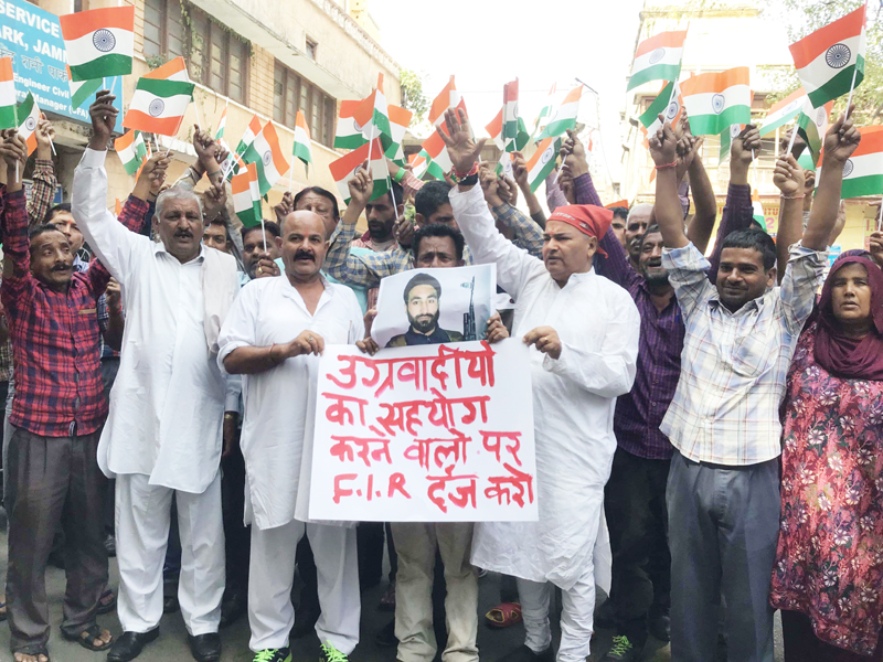 Activists of Dogra Front and Shiv Sena during a protest at Jammu on Tuesday.