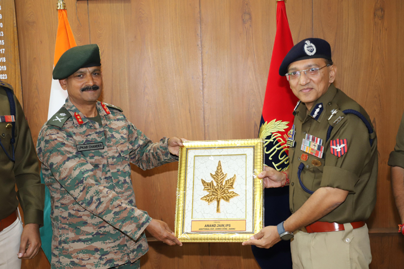 JAMMU, Nov 5: Additional Director General of Police (ADGP) Jammu Zone, Anand Jain, along with senior officers, bid farewell to Major General Upkar Chander, the outgoing General Officer Commanding (GOC) of the Delta Force, at the Zonal Police Headquarters in Jammu.