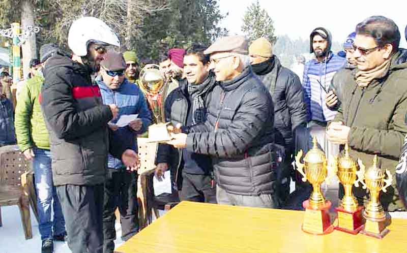 Advisor KK Sharma presenting trophy to winners during a function organized by the Indian Institute of Skiing and Mountaineering at Gulmarg.