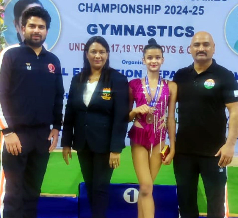 JAMMU, Jan 30: Advita Chaudhary, a student of Army Public School Domana, Jammu, secured a bronze medal in the 68th National School Games U-14 Girls Rhythmic Gymnastics competition held in Kolkata. Advita’s outstanding performance in the individual apparatus event earned her this prestigious honour, marking a significant achievement for Jammu and Kashmir.
