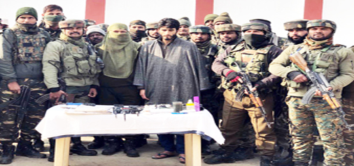 Affaq Ahmad Bhat in Army custody with recoveries in Handwara on Friday. (UNI)