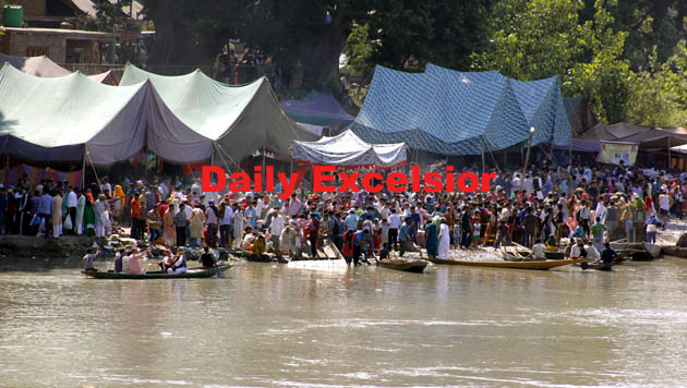 After 75years thousands of kashmiri pandit migrants who came from various parts of india took a holy dip at Sangam Priyag at Shadipora Sumbal in Ganderbal district….Excelsior/Shakeel-ul-Rehman.