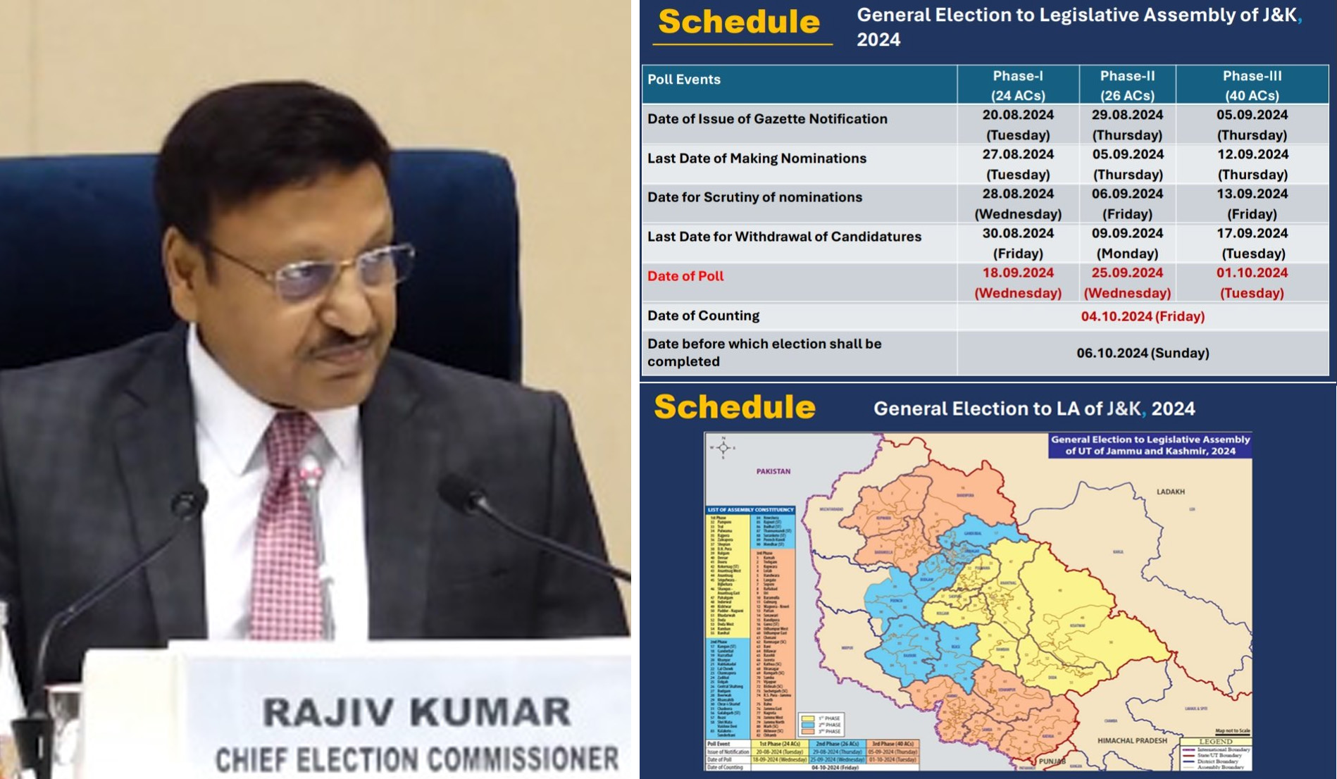 “Assembly polls in Jammu and Kashmir will be held in three phases, with voting on September 18th, September 25th, and October 1st. Counting of votes on October 4,” Kumar said.