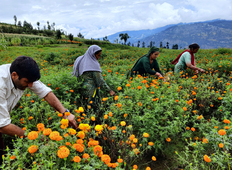 Womenfolk of Kellar Valley are a happier lot as they are not only reaping in rich benefits but also enjoy and find it easy to work in marigold fields in comparison to that of Maize or paddy fields.