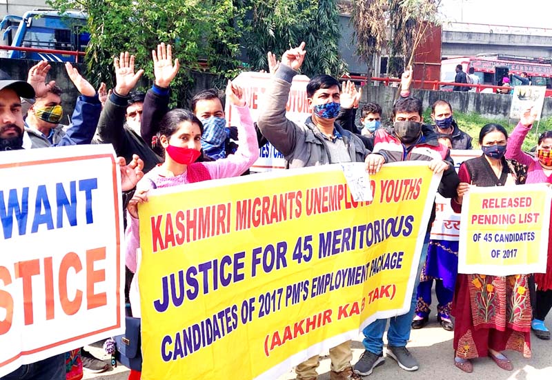 JAMMU, Feb 17: The protest of the 45 aggrieved left out Kashmiri migrant youth who had applied under PM package over a decade back entered into 123rd day today.