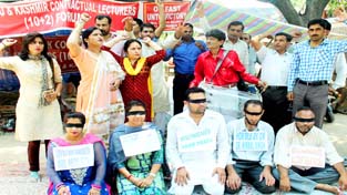 JAMMU, May 19: On 95th consecutive day of their ongoing hunger strike, Contractual Lecturers (10+2) today held a strong protest demonstration blindfolded amidst beating of drums.