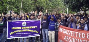 JAMMU, Mar 9: A day after observing Mass Casual Leave, all the employees of non teaching and non gazetted cadre in Jammu University continued their token strike by suspending work for four hours and holding strong protest demonstration in front of Vice Chancellor’s Secretariat on the campus, here today.