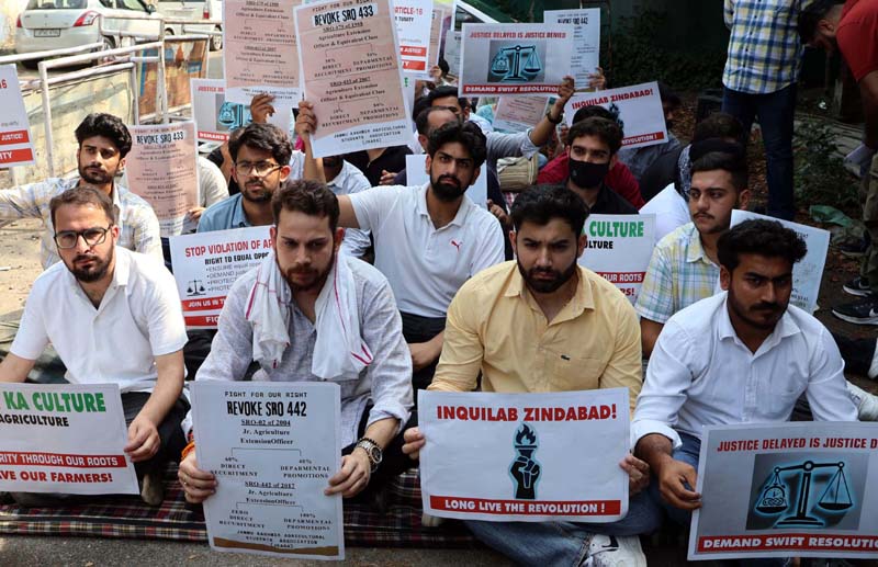 They are demanding 50:50 ratio in recruitment as per SRO-179 for Agricultural Extension Officer (Gazetted Cadre Post) Technical, immediate referral of vacant posts of JKPSC as per the direct recruitment quota which have not been referred since 2008 and revocation of SRO-442 (100 percent departmental promotions) for non-gazetted entry level technical posts.