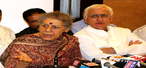 AICC general secretary Ambika Soni addressing media along with senior Congress leader Salman Khursheed in Srinagar on Sunday. -Excelsior/Shakeel
