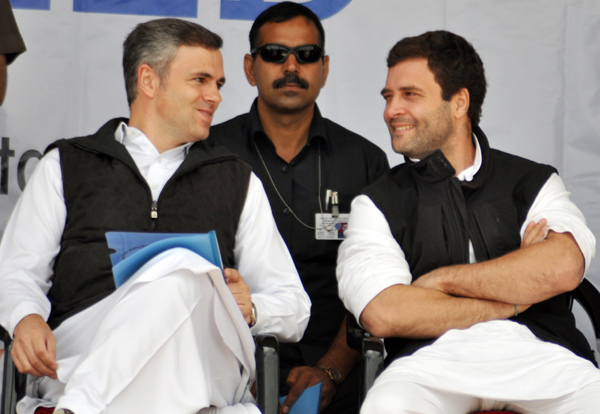 AICC(I) vice president Rahul Gandhi and Chief Minister Omar Abdullah at a function in Budgam on Saturday. -Excelsior/Amin War