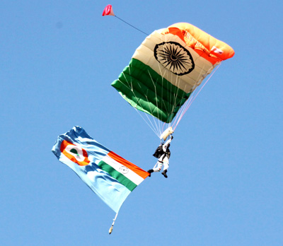 A paradrop by the universally acclaimed IAF Akash Ganga Sky Diving team was followed by display of synchronised arms drill by the Air Warrior Drill Team.