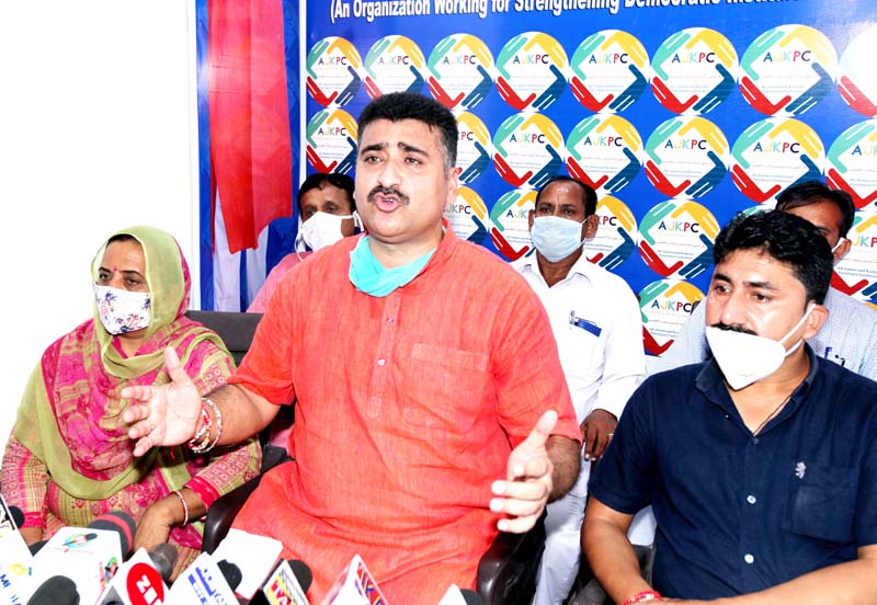 AJKPC president, Anil Sharma addressing a press conference at Jammu on Friday. -Excelsior/Rakesh