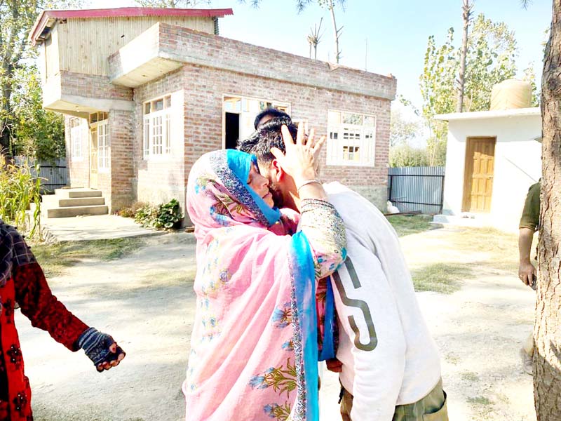 A woman hugs her son as he surrendered before Army and police in Sopore on Thursday. -Excelsior/Abid Nabi