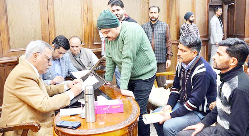 A deputation of farmers met the Advisor and shared their concerns regarding marketing and sale of their agriculture produce. The Advisor suggested farmers to get organized and undertake Cluster and Cooperative farming to achieve higher price for their yield. He recommended farmers to take help from SKUAST Jammu in this venture.