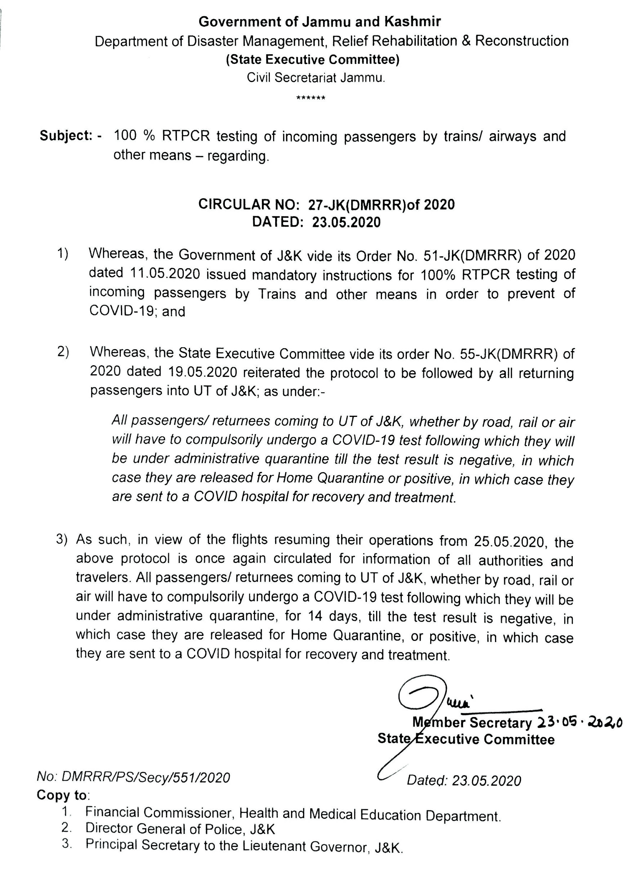 All passengers returning to J&K by road/air will be kept in 14 days quarantine: J&K Govt By Daily Excelsior - May 23, 2020 Share FacebookTwitterWhatsAppPinterestLinkedinCopy URLTelegramEmailTumblrReddItPrintKoo Follow our WhatsApp channel