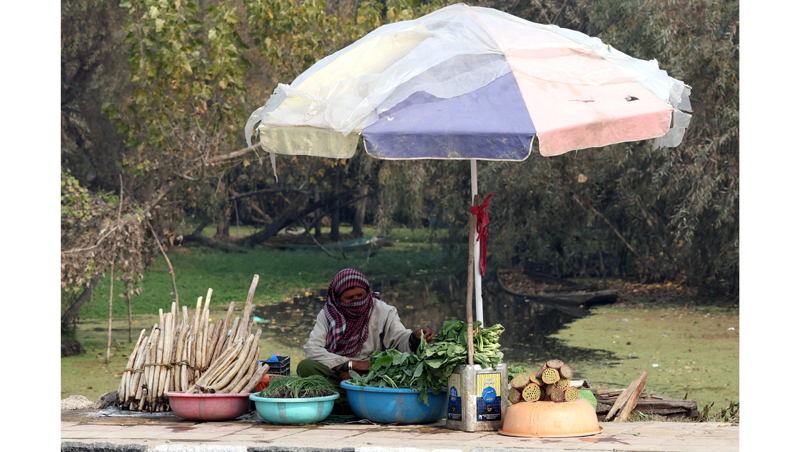 Along the banks of Dal Lake, a local woman vendor sells fresh vegetables, including lotus stems, grown in the lake’s fertile interiors. -Excelsior/Shakeel
