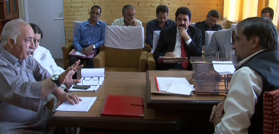 Minister for Forests Mian Altaf and Minister for R&B Abdul Majeed Wani discussing a point in a meeting at Srinagar on Sunday.