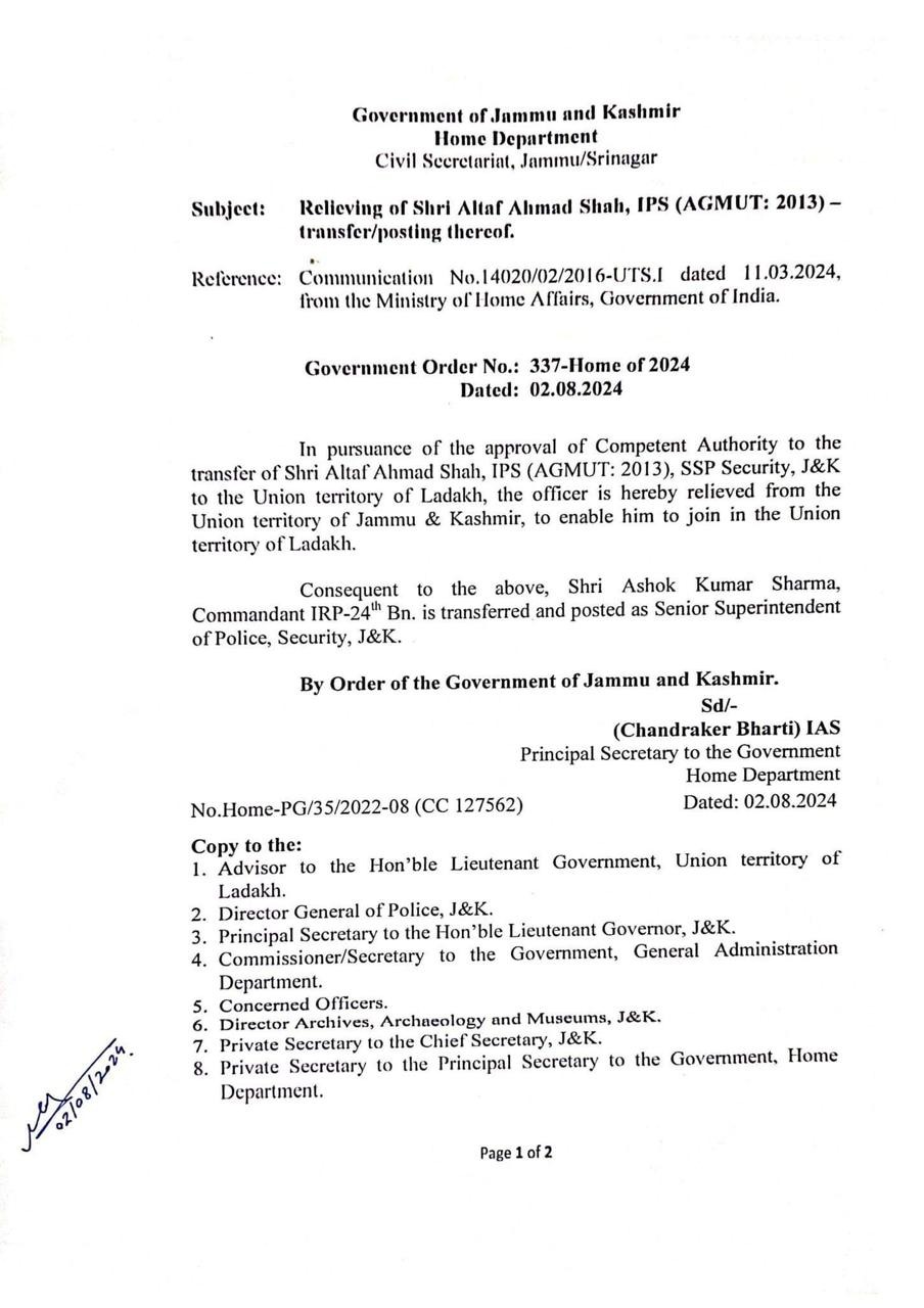 JAMMU, Aug 2: The Home Department of Jammu and Kashmir Government has relieved Altaf Ahmed Shah, SSP Security J&K, to enable him to join a new place of posting in the Union Territory of Ladakh. Consequently, Ashok Kumar Sharma, Commandant IRP 24th Battalion, has been transferred and posted as SSP Security J&K.