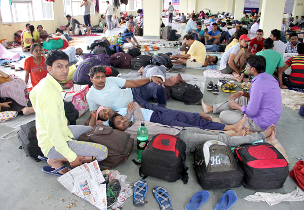 Stranded Amarnath yatris taking rest at Bhagwati Nagar Yatri Niwas on Sunday. —Excelsior/Rakesh