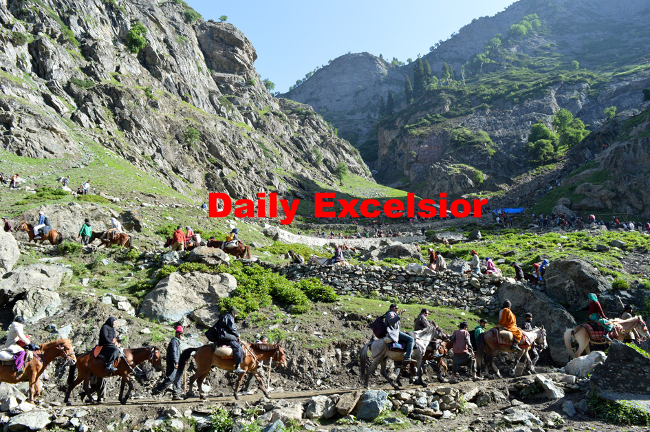 Amarnath yatris heading towards holy cave via Chandanwari route. -Excelsior/Sajad Dar
