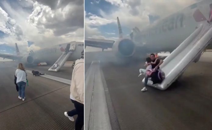 Video showed passengers frantically sliding down an inflatable safety slide as thick black smoke billowed from flames engulfing the rear left side of the aircraft.