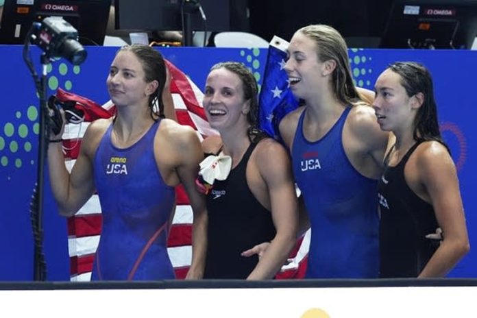 The Americans swam a time of 3 minutes, 49.34 seconds, breaking their own old mark of 3:49.63 set a year ago in the Paris Olympics.