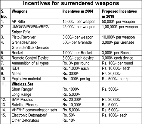 The ‘Rehabilitation Policy’ accessed by the Excelsior proposed four-times to 10-times jump in the payment to the militants for handing over arms, ammunition and explosives as compared to the previous `Surrender Policy’ of 2004. Rs one lakh has been proposed for UMG/GMPG/Pika/RPG/Sniper Rifle as against previous Rs 25,000. For AK rifle, the militant will get Rs 50,000 as against Rs 15,000 per weapon.