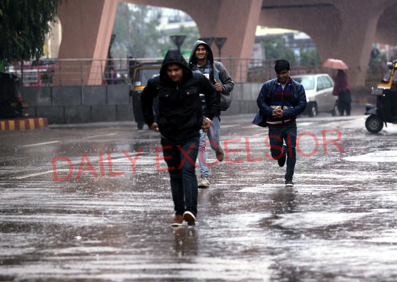 Amidst heavy rain, youth running for cover on a Jammu road on Monday. -Excelsior/Rakesh