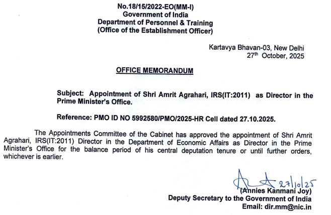 New Delhi, Oct 27: The Government of India on Wednesdy approved the appointment of Shri Amrit Agrahari, an Indian Revenue Service (IRS) officer of the 2011 batch, as Director in the Prime Minister’s Office (PMO).