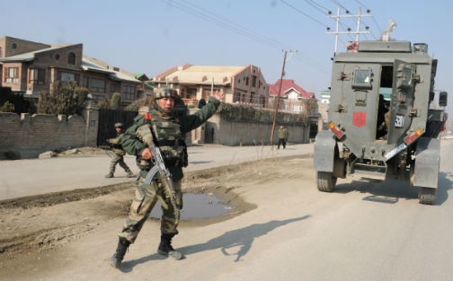 An alert Army trooper keeps a tight vigil on a road near Hyderpora Byepass on Srinagar-Baramulla National Highway after militants opened fire on a CRPF patrolling party on Saturday. -Excelsior/ Amin War