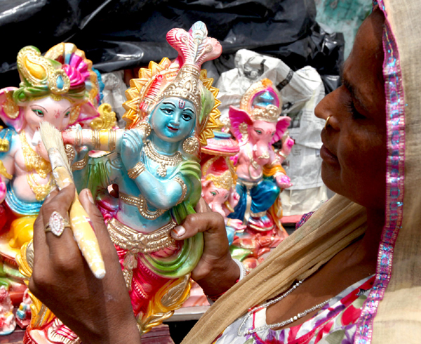 An artist gives a final touch to Lord Krishna idols in Jammu ahead of Janamashtami festival. —Excelsior/Rakesh