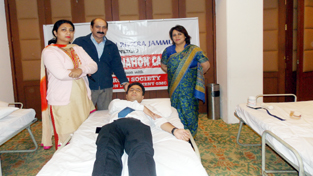 An employee donating blood during a camp by Hotel Fortune Inn Riviera on Monday.