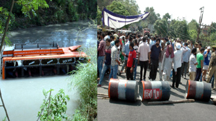 An ill fated mini-bus submerged in canal (left) and people protesting on Jammu-Akhnoor road at Domana (Right). -Excelsior/ Rakesh