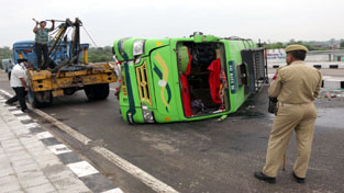 An ill-fated vehicle which turned turtle on Tawi bridge
