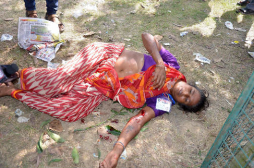 An injured woman laying on the ground after a bomb blast during the Hunkar Rally of BJP’s Prime Minister candidate Narendra Modi at Gandhi Maidan in Patna. (UNI)