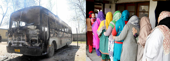 An SRTC bus torched by the mob at Budgam (left) and women queuing up to cast their votes at SP College in Srinagar on Sunday. — Excelsior/Shakeel