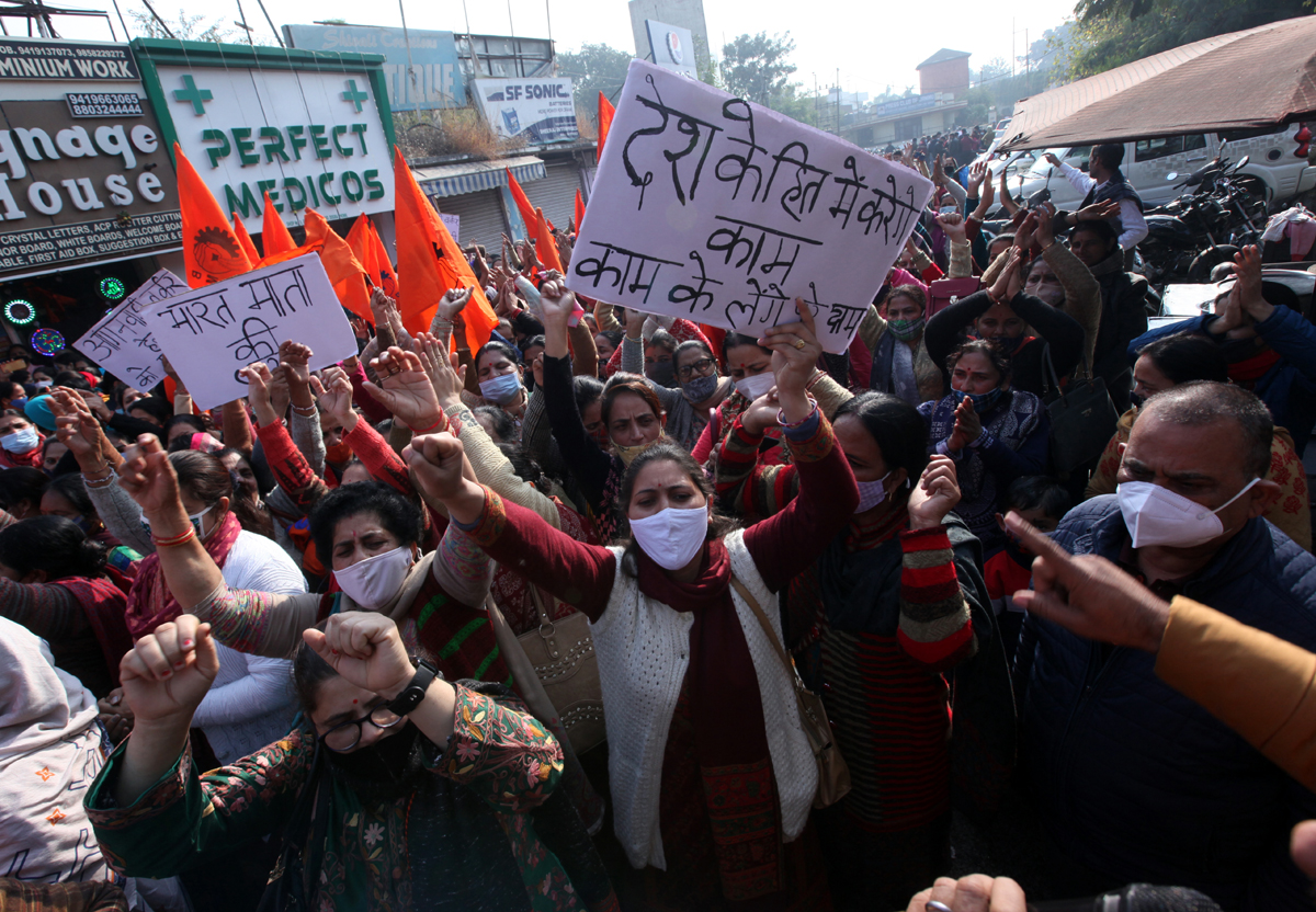 Anganwadi workers and helpers staging protest demonstration in Jammu on Thursday. —Excelsior/Rakesh By Daily Excelsior - December 24, 2021 Share FacebookTwitterWhatsAppPinterestLinkedinCopy URLTelegramEmailTumblrReddItPrintKoo Anganwadi workers and helpers staging protest demonstration in Jammu on Thursday. —Excelsior/Rakesh Anganwadi workers and helpers staging protest demonstration in Jammu on Thursday. —Excelsior/Rakesh Follow our WhatsApp channel
