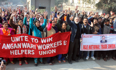 JAMMU, Jan 4: Anganwadi workers, helpers of ICDS projects under Social Welfare Department, casual labourers and other contractual workers held strong protest demonstration and also took out a large rally here today.