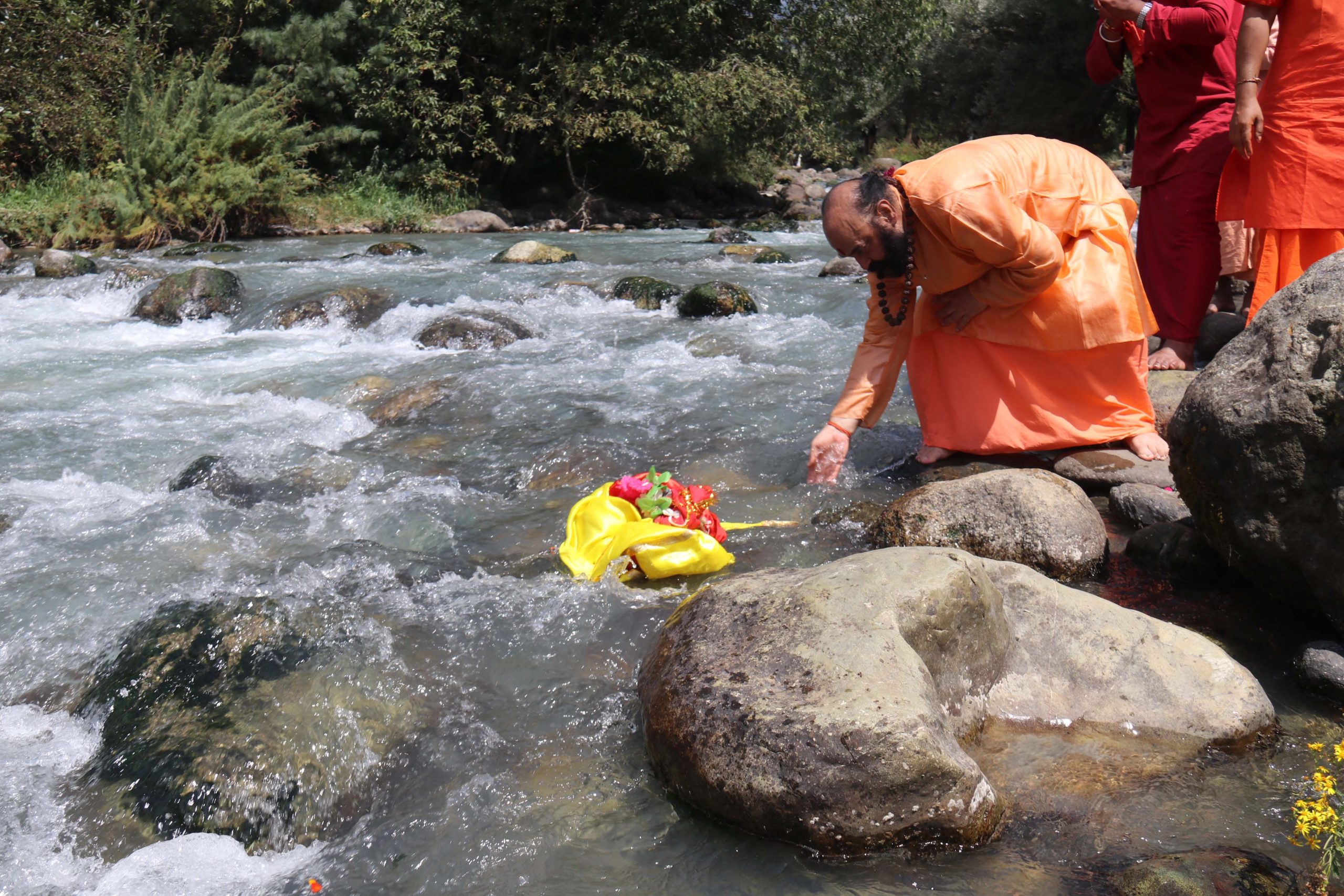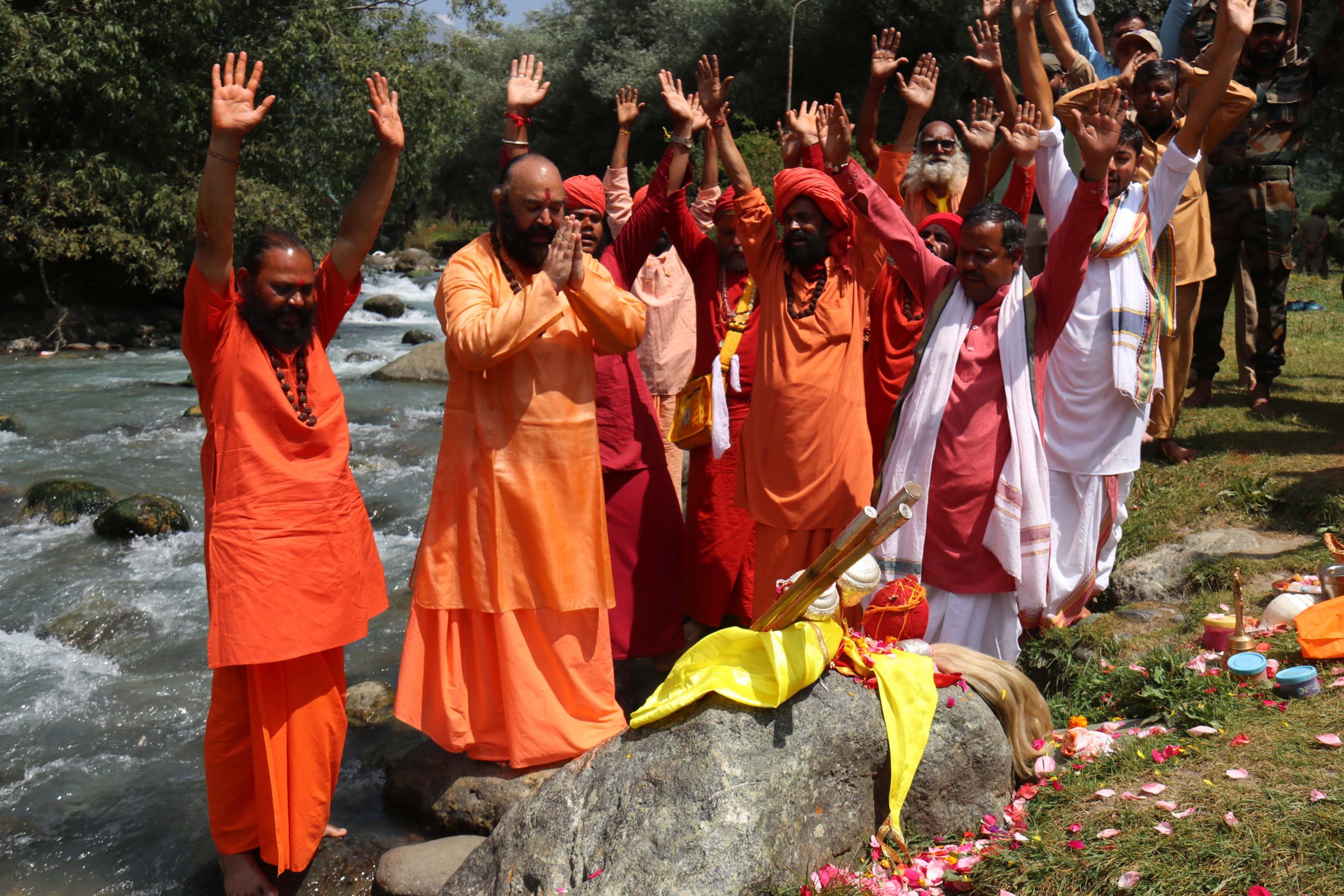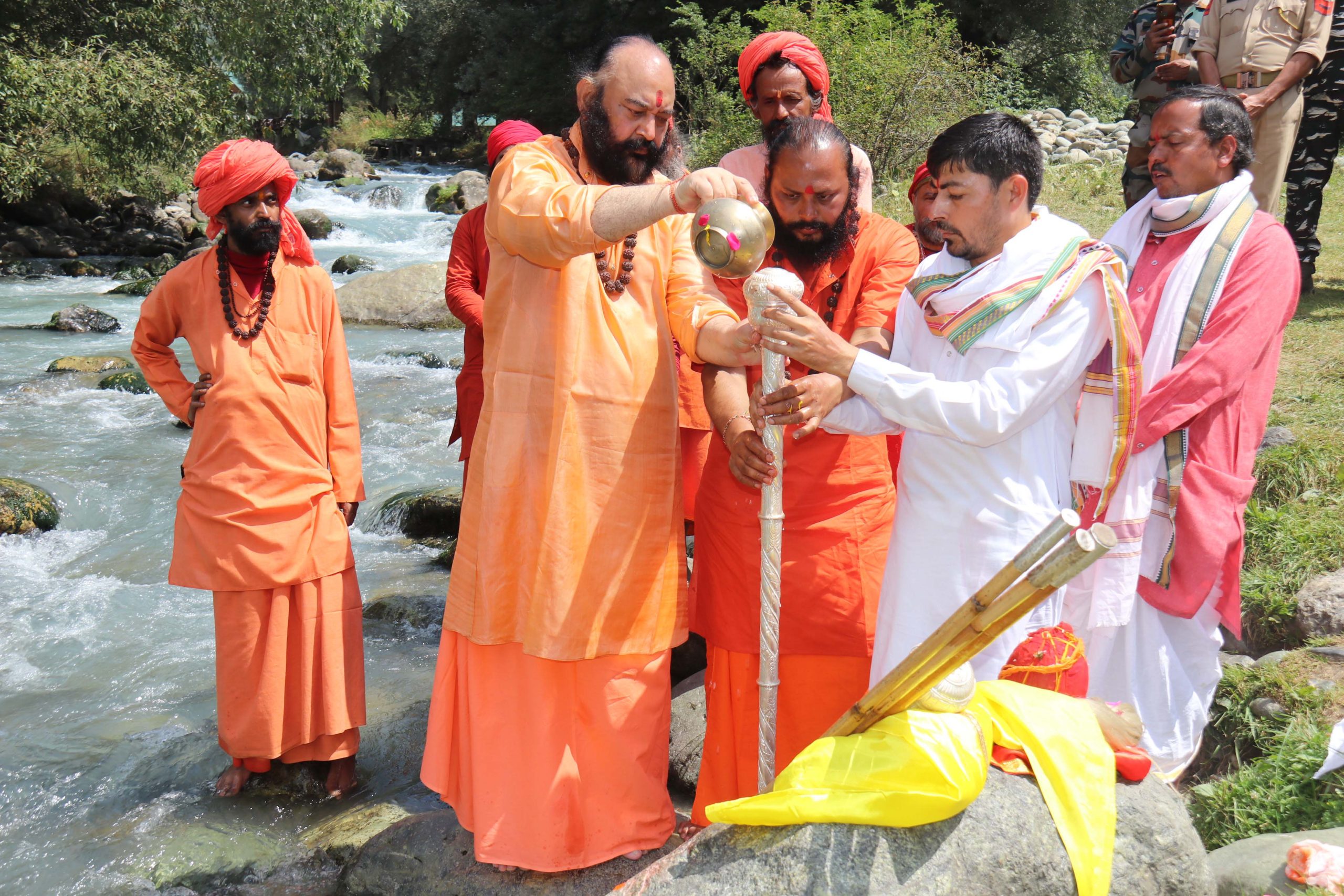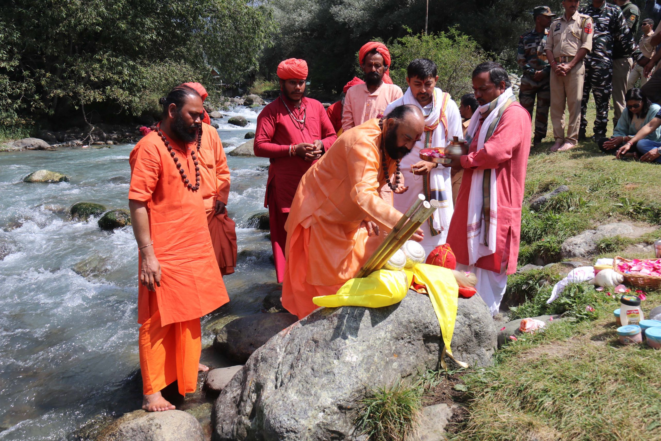 SRINAGAR, Sept 7: Annual pilgrimage of Chhari-Mubarak Swami Amarnath Ji culminated on 2nd of September at Pahalgam with its last rituals ‘Pujan’ & ‘Visarjan’, which were performed at the bank of river Lidder after Panchak’ that ended at 10:38 this morning. Puja started at 11am and lasted for about 90 minutes. Sizable number of Sadhus and tourists who had come from various parts of the country joined the Pujan. Later, ‘Karri-Pakouri’ Bhandara was organized and ‘Dakshina’ was offered to them. Chhari-Mubarak left Pahalgam at 4:00PM and reached its abode Dashnami Akhara at 6:20pm.
