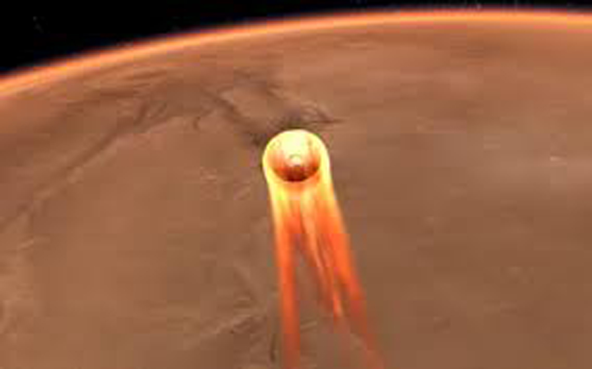 Speeding faster than a bullet at 12,300 miles (19,800 kilometers) an hour, the heat-shielded spacecraft encounters scorching friction as it enters Mars’ atmosphere. (AGENCIES)