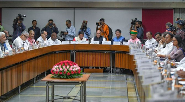 Defence Minister Rajnath Singh, the deputy leader of the House in Lok Sabha; Union Minister Piyush Goyal, the leader of the House in Rajya Sabha; and Parliamentary Affairs Minister Pralhad Joshi represented the government in the meeting.