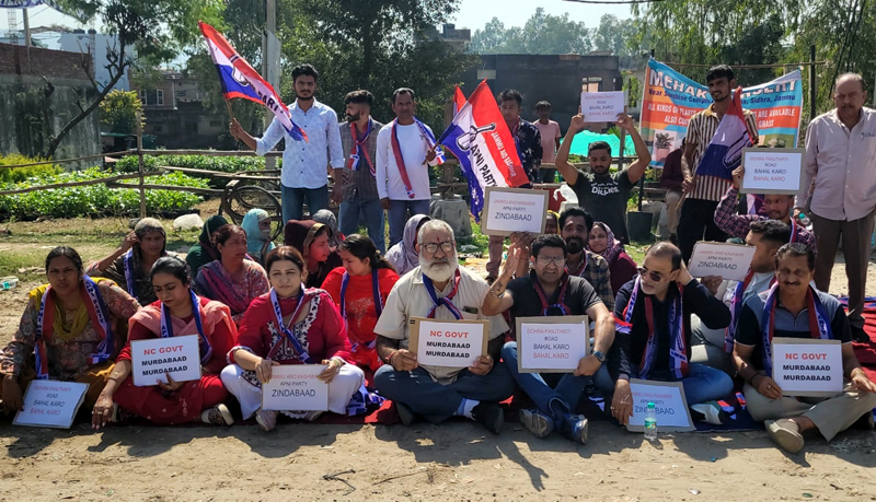 JAMMU, Oct 12: – Leaders and workers of the Apni Party today held a strong protest at Sidhra, demanding immediate restoration of the Sidhra-Panjtirthi road that was severely damaged during the recent floods.