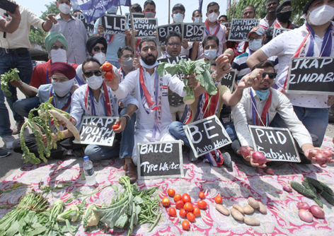 As a mark of protest, the protesters comprising of PhD scholars, LLB, BTech students and Engineers sold vegetables to showcase lack of Government jobs for the unemployed youth. They were raising slogans while holding vegetables as a mark of protest.