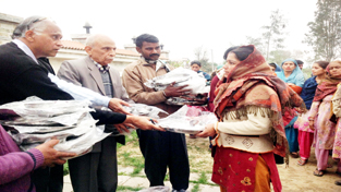 The items for distribution were received by Sabha from Sarvdeshik Arya Pratinidhi Sabha, Delhi. The members of team who visited the site were Bharat Bhushan Arya (president), Ravi Kant (secretary) and Subhash Gupta (library incharge, Arya Pratinidhi Sabha J&K).