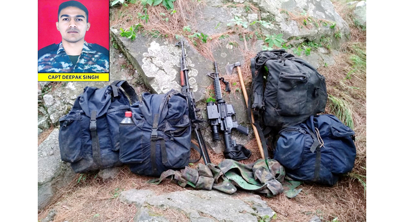 Arms and other items recovered from slain terrorist. (Inset) Martyr Capt Deepak Singh. -Excelsior/Tilak Raj By Daily Excelsior - August 15, 2024 Share FacebookTwitterWhatsAppPinterestLinkedinCopy URLTelegramEmailTumblrReddItPrintKoo Arms and other items recovered from slain terrorist. (Inset) Martyr Capt Deepak Singh. -Excelsior/Tilak Raj Arms and other items recovered from slain terrorist. (Inset) Martyr Capt Deepak Singh. -Excelsior/Tilak Raj Follow our WhatsApp channel