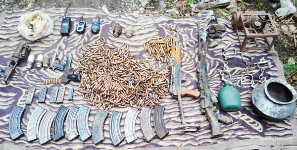 Recoveries made from the spot included one AK-56 rifle, one .303 rifle, two Chinese pistols, one Under Barrel Grenade Launcher (UBGL), two hand grenades, 11 AK-56 magazines, four Chinese pistol magazines, three UBGL grenades, 11 pistol rounds and huge quantity of 7.62mm assorted rounds along with other sustenance stores.