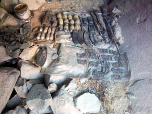 Recoveries made from the hideout included one AK-56 rifle along with four magazines, 150 rounds of AK-56, one 7.62mm Self Loading Rifle (SLR) along with two magazines, 12 hand grenades, eight UBGL grenades, two hand held radio sets, one radio set antenna, two all purpose binoculars and two combat pouches.